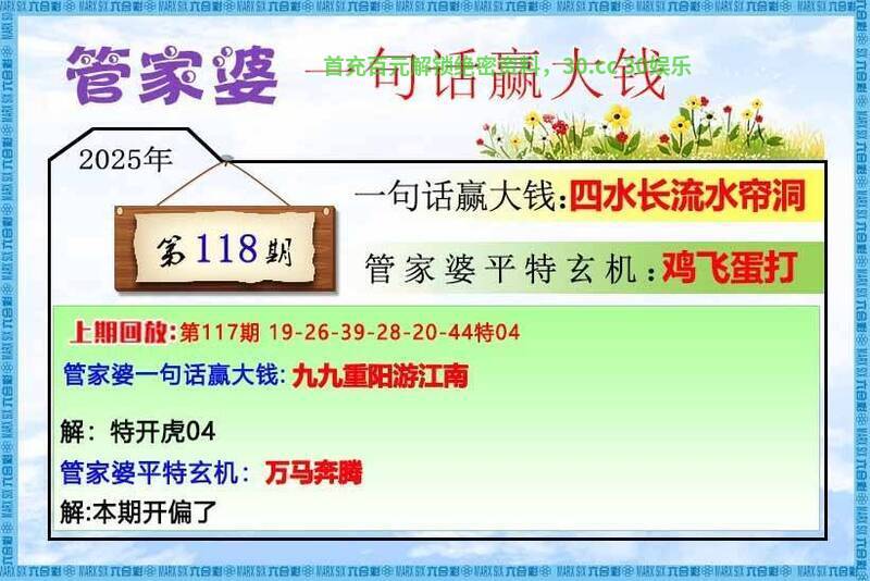 | 118期管家婆一句话:四水长流水帘洞 解:四水长流水帘洞,解四头特码40-49,解水肖鼠猪。 综合:龙猪羊鼠牛马 |