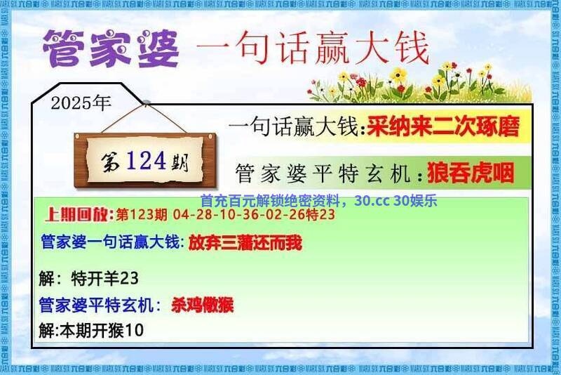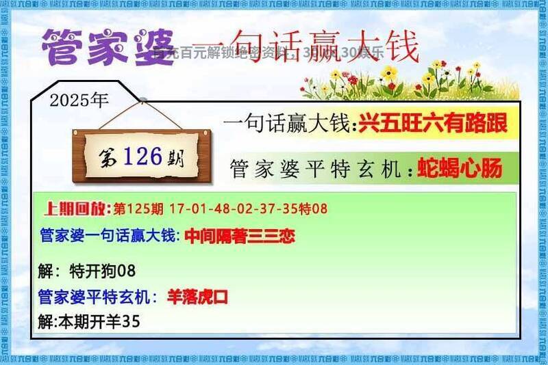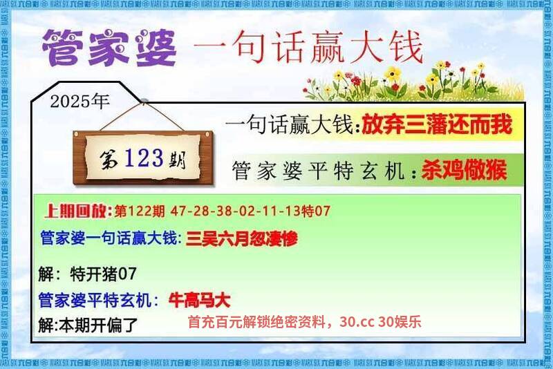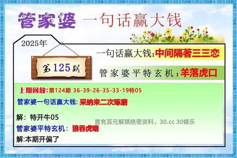| 121期管家婆一句话:开出三五两心数 解:开出三五两心数,解大数特码25-49,解单肖兔牛猪鸡羊蛇。 综合:牛兔龙羊鸡狗 |